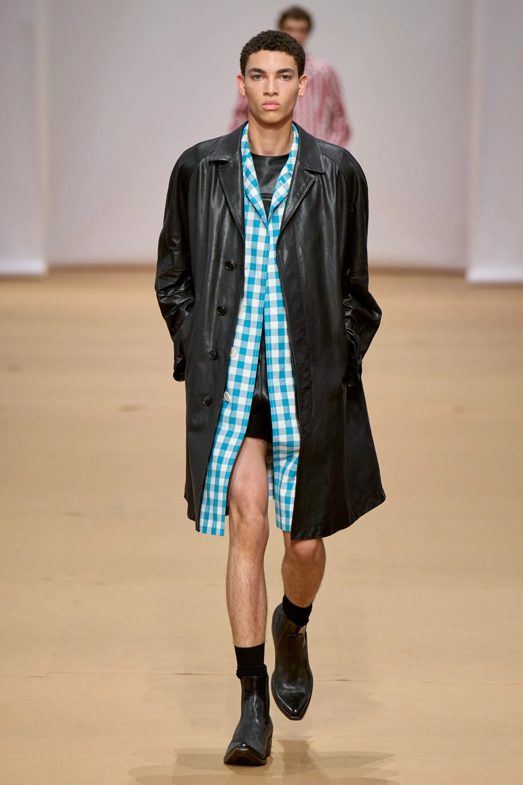 Исторически клетку виши (она же гингем) часто использовали для скатертей, салфеток и другого домашнего текстиля. В женских коллекциях эта разновидность клетки давно стала нормой, а вот мужские коллекции только подтягиваются. Из коллекций Prada, Gucci и Ami мы почерпнули классный контраст между наивностью клетчатой ткани и серьезными вещами вроде кожаных плащей, пальто и костюмов.