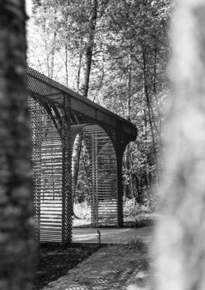 «Акведук» в качестве одного из экспонатов парка выбрала Ксения Новохатько (сокуратор маршрута «Малевич в лесу» — Прим. BURO.). Так как ландшафт местности в парке Малевича не позволял повторить первоначальный объект в натуральную величину, решено было воспроизвести только фрагмент композиции. Так «Акведук» стал своего рода «руиной», воспоминанием о работе мастера. «Руина» в концепции романтического парка свидетельствует о всепоглощающем времени, о всепобеждающей силе природы, постепенно захватывающей следы цивилизации. Отсылая своими формами к древнеримским акведукам, прозрачная линейная конструкция Александра Константинова как будто впускает в себя природу, с определенной точки зрения «растворяется» в ландшафте, подобно тому, как античные руины, обраставшие деревьями, постепенно становились органичной частью природного окружения.