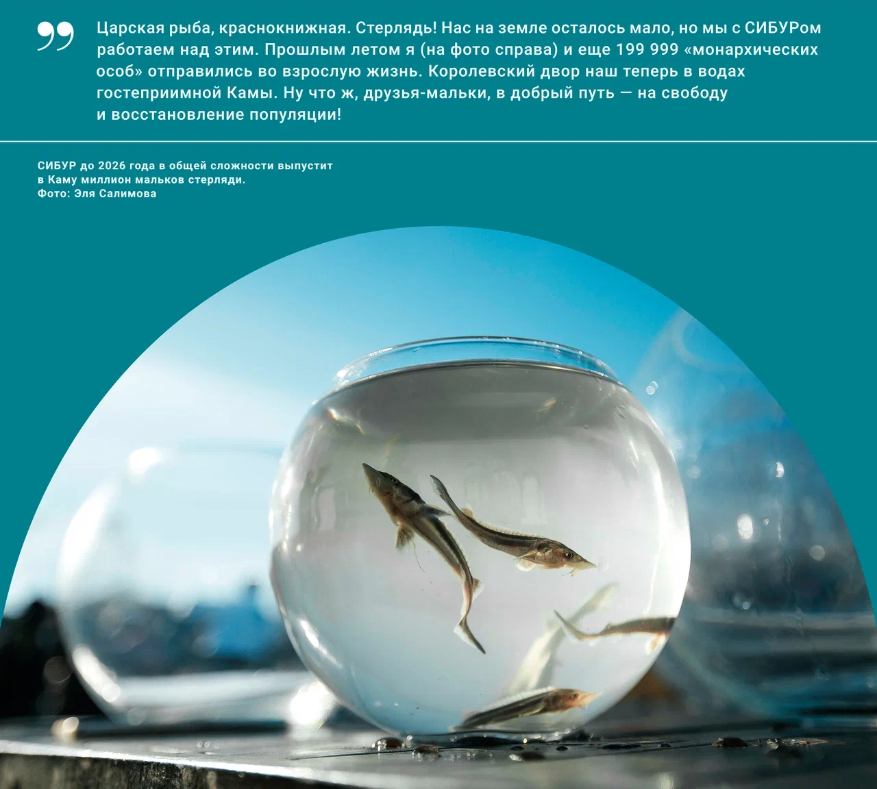 Нижнекамская царская рыба стерлядь поблагодарила компанию за возможность отправиться во взрослую жизнь. Краснокнижная красавица и еще 199 999 ее друзей-мальков обрели новый дом в водах гостеприимной Камы. До 2026 года компания выпустит в реку миллион мальков стерляди.