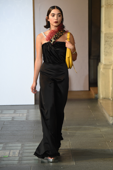 За 48 часов часов до шоу в списке моделей, участвующих в показе, не было ни одной знаменитости. О спонтанности Миуччи Прады мы уже слышали от ее сотрудников и убедились в этом еще раз: за день команда Miu Miu обзвонила гостей шоу с предложением поменять роль — не смотреть на шоу, а участвовать в нем. В числе решившихся пройтись по кинематографичному отелю Regina оказались Сэди Синк, Хлоя Севиньи, Гвендолин Кристи, Кейт Босуорт и Ума Турман, закрывшая показ в изумрудно-леопардовом платье и плаще. Актриса дружит с Миуччей тридцать лет и традиционно выходит на церемонии «Оскара» в платьях Prada.