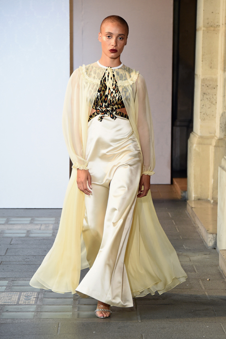 Эта идея легкости и спонтанности стала основой не только организации показа, но и самой коллекции. Блузки в цветах здесь накидываются поверх кожаных комплектов, как в образе Хлое Севиньи, «лыжные» пуловеры рифмуются с близкими к white-tie платьями, а легкие комплекты, которые легко представить на какой-нибудь герцогине восемнадцатого века — с леопардовым принтом. Кто еще, как не Миучча Прада, очистит наши головы от предрассудков и научить воспринимать непростые сочетания с такой легкостью?