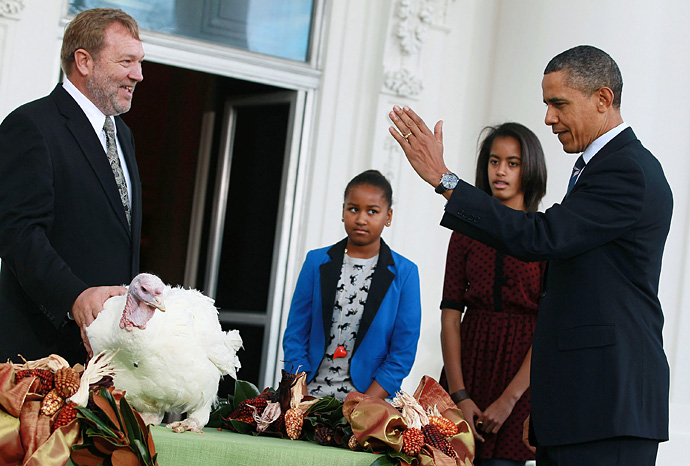 На церемонии в Розовом саду Обама вместе со своими дочерьми Малией и Сашей торжественно "помиловал" индюков по имени Либерти (от англ. liberty — "свобода") и Пис (от англ. peace — "мир"). Справедливости ради стоит отметить, что Барак Обама не первый президент Америки, который устроил подобную акцию. Впервые церемонию "помилования" индеек провел Авраам Линкольн в 1863 году, а ежегодной традиция стала в 1947 году при Гарри Трумэне.