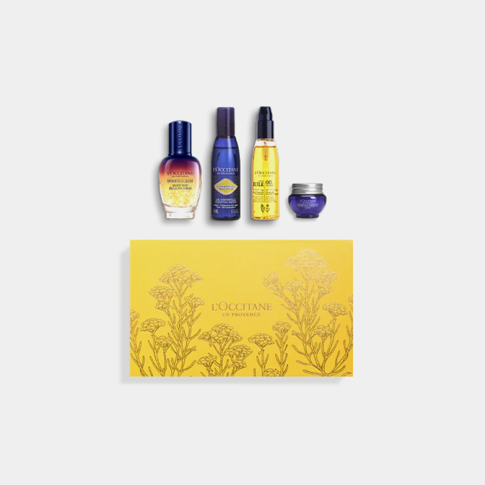 В увесистой золотой коробке — средства с экстрактом и эфирным маслом корсиканского бессмертника (или иммортели) в составе. Это растение известно своими антивозрастными свойствами: все продукты из набора направлены на питание, повышение тонуса и упругости кожи. Получается полноценная система ухода с мягким очищающим маслом, эфирным тоником, дневным кремом и ночным эликсиром.