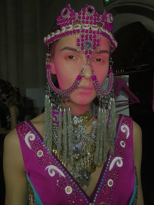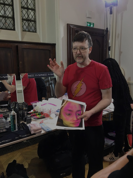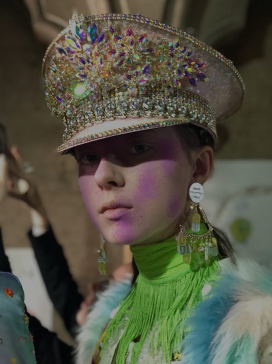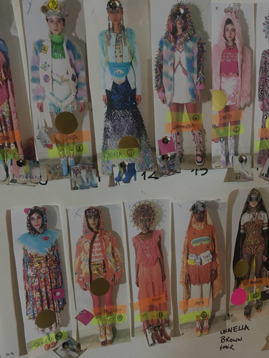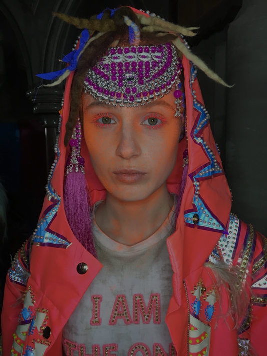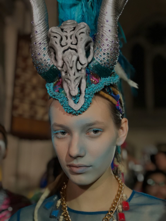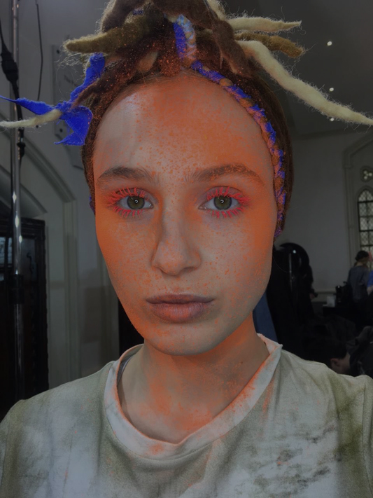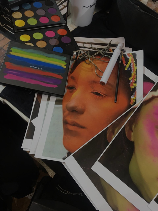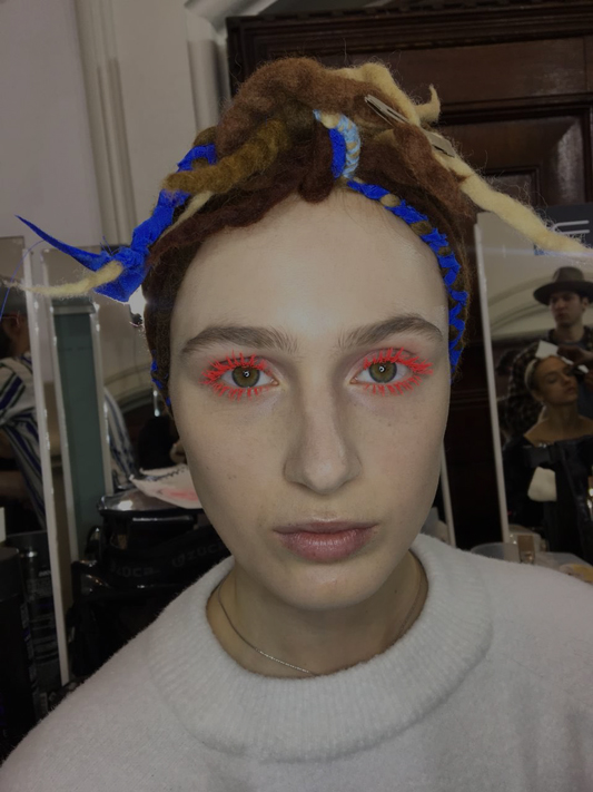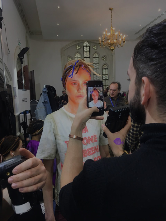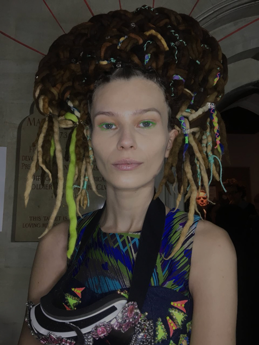 Сбор команды начался в 7:00 и проходил в церкви The American Cathedral. Главным визажистом выступил Кабуки, не первый сезон создающий яркие образы для бренда. Команда разложила косметику и ждала моделей и разъяснений по макияжу. Вдохновение для образа — Mad Max in pastels. Основной задачей визажистов было создать плотный тон и цветные ресницы разных оттенков — кораллового, оранжевого, лилового, голубого. На каждый макияж у визажистов уходило по 30 минут. Когда девушки вышли на line up, Кабуки рассыпал на их лицах яркие пигменты. Это сложная задача, ведь модели уже были в дизайнерской одежде. Чтобы обезопасить её, использовали специальные пеньюары. Показ проходил под сильную музыку Brother in Arms — Tom Holkenborg. ФОТО https://www.dropbox.com/sh/kwnutt9fmrmshvr/AADdirNid6l_Y8PP6EH3ryjVa?dl=0