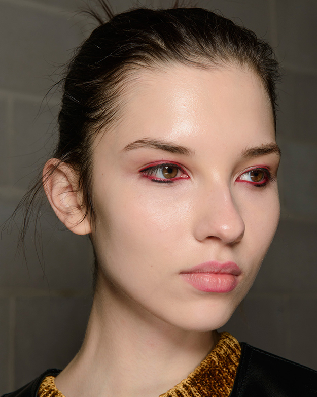 Для создания образа Томас тщательно проработал моделям кожу, добившись идеально ровного матового покрытия. Продукты для скульптурирования визажист не использовал. Основное средство в макияже — красный карандаш Chromagraphic от M.A.C в оттенке Basic Red. В России он не представлен, поэтому в качестве альтернативы можно использовать похожий цвет в NYX — он стойкий и мягкий, поэтому подойдет для нежной кожи в этой области. Карандашом нужно проработать слизистую на нижнем веке, внутренние уголки. Затем прорисовать стрелку черной подводкой на верхнем веке и на середине нижнего. После высыхания над верхней линией провести параллельную красную.
