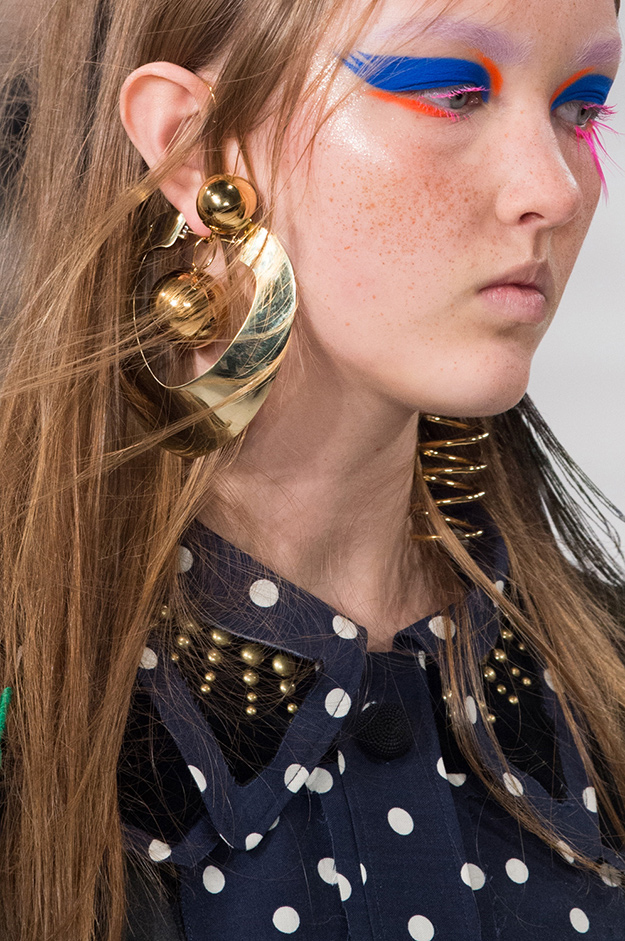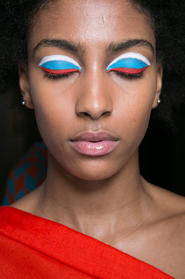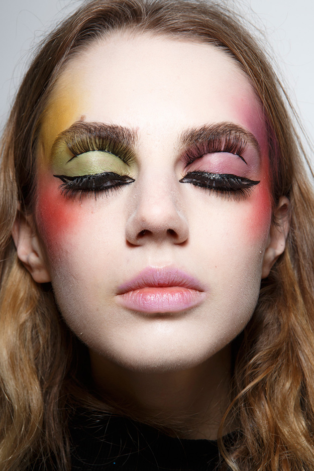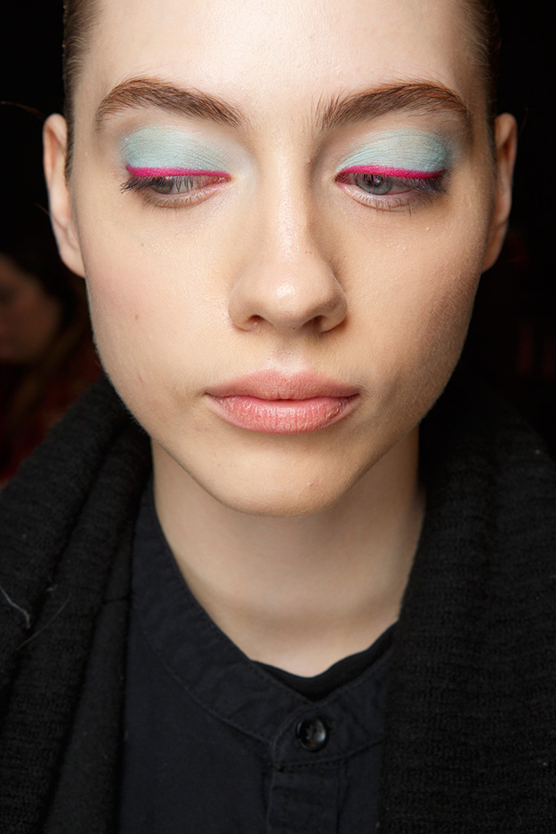 Визажисты показов Dans La Vie и Maison Margiela показали, как лучше всего использовать многогранную цветовую палитру в макияже глаз. На показе House of Holland в качестве дополнительного акцента на внутренний уголок глаза нанесли тени с глиттером. Для показа Ryan Lo был выбран необычный и броский макияж в стиле аниме.