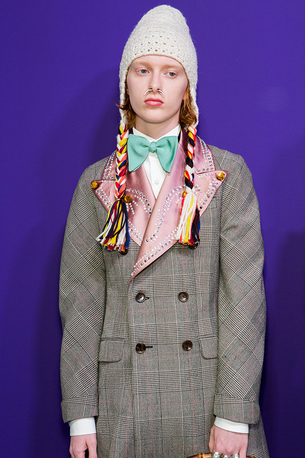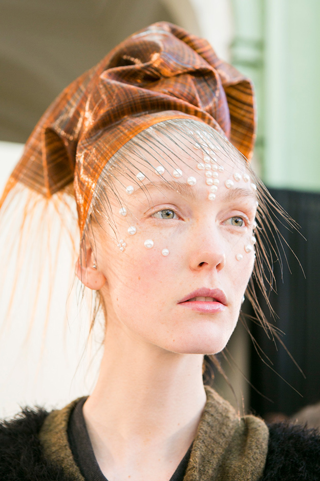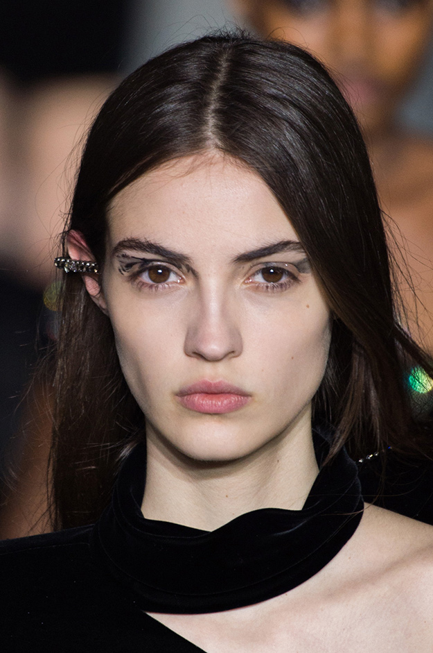 На некоторых показах макияж был дополнен эффектными украшениями на лице. У моделей с показа Gucci был пирсинг в носу, девушкам с показа Balmain надели специальный аксессуар для губ, моделям Junya Watanabe поместили на лоб необычную фурнитуру.