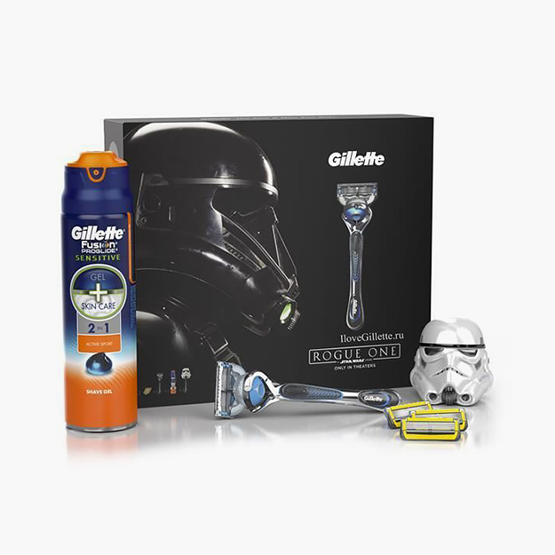 Специально для любителей классического груминга и поклонников «Звездных войн» компании Gillette и Lucasfilm выпустили набор в стиле фильма «Изгой-один: Звездные войны. Истории». В набор вошли бритва, сменные кассеты и гель для бритья.