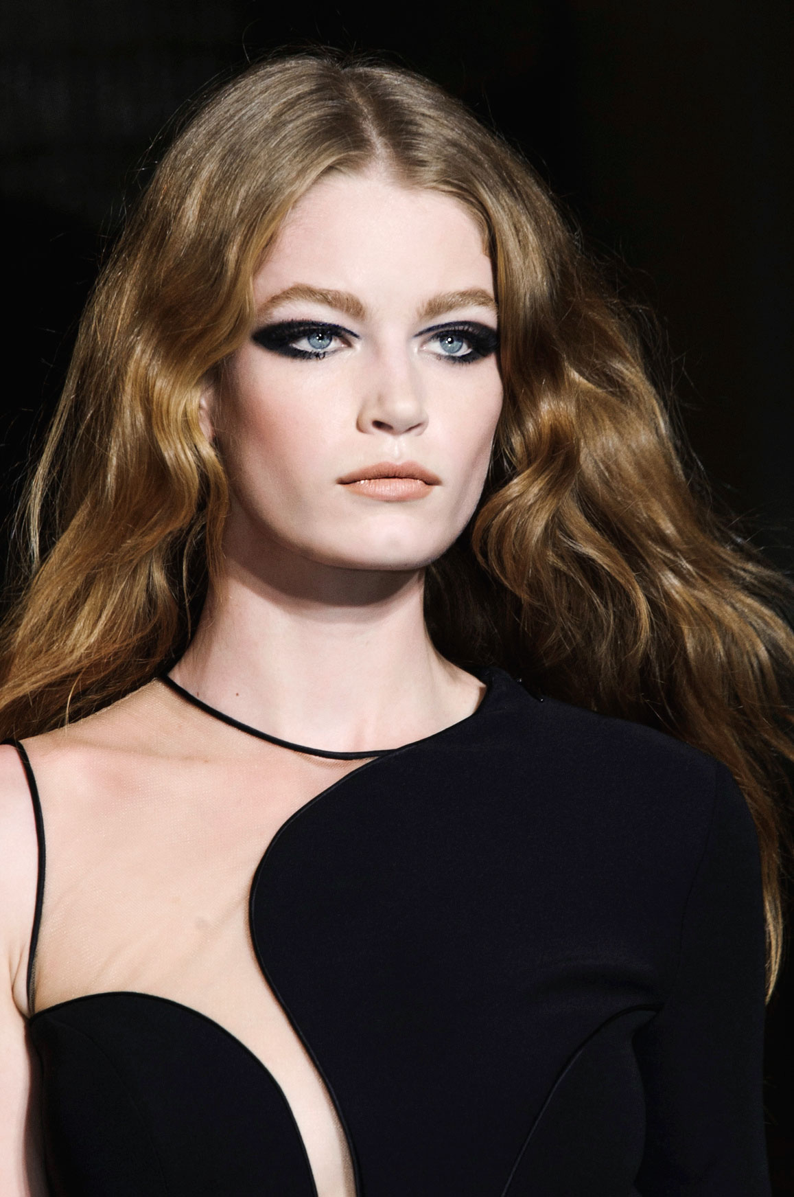 Тонкие и небрежно нанесенные, но симметричные линии с показа Anthony Vaccarello стали интересной вариацией привычных стрелок. Проще всего такой образ создать при помощи подводки-фломастера или нити.