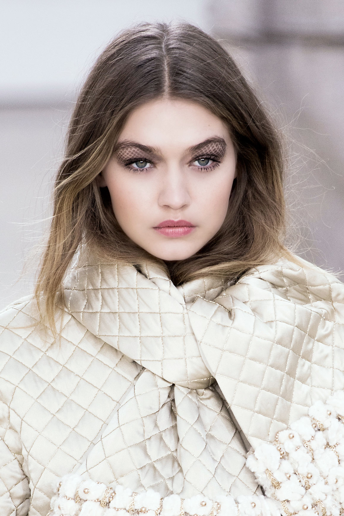 Кажется, визажисты решили сделать перерыв в образах с кружевными масками и аппликациями на лице и снова вернулись к теням в макияже. Автором образа для шоу Givenchy стала Пэт Макграт. Она нанесла серо-коричневые кремовые тени на все подвижное веко, на виски и до линии роста волос.