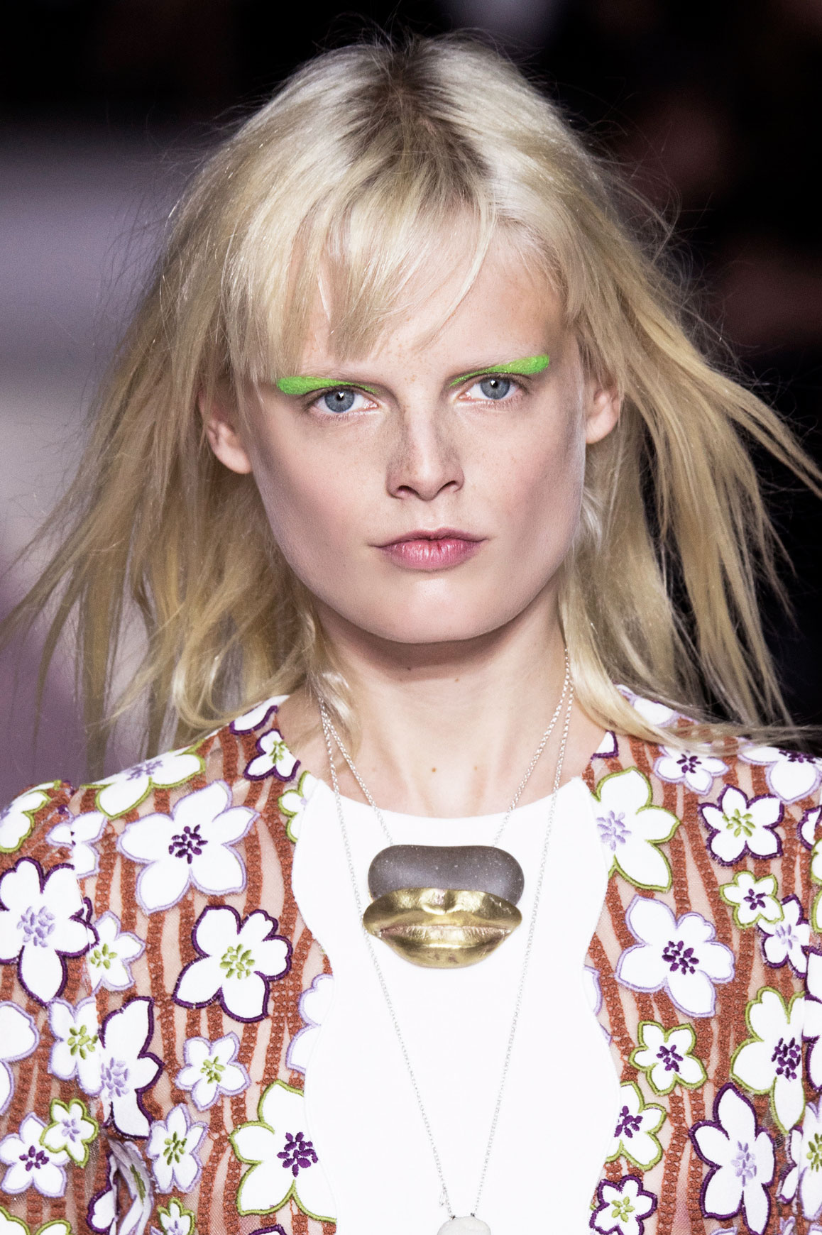Вэл Гарланд нарисовала моделям широкие стрелки прямо под бровями, используя цветную подложку и блестки. Подвижная часть века не накрашена, и поэтому взгляд не выглядит тяжелым.