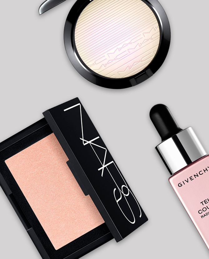 Хайлайтер удобно наносить кисточкой на места высветления, затем нужно просто растушевать пальцем. Сияние получается освежающим, жемчужным.