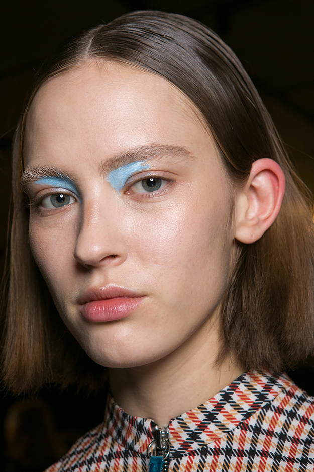 Визажисты M.A.C использовали в образе основные цвета из коллекции: пастельные голубой, зеленый, розовый и желтый. Для создания макияжа они использовали разноцветные кремовые пигменты в стике (которые у нас, к сожалению, не продаются). Место мягких растушевок заняли широкие мазки во внутреннем и внешнем уголках глаз. Дополнил образ стробинг.