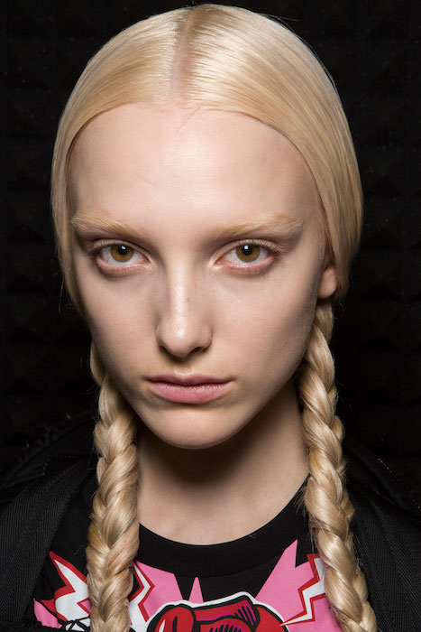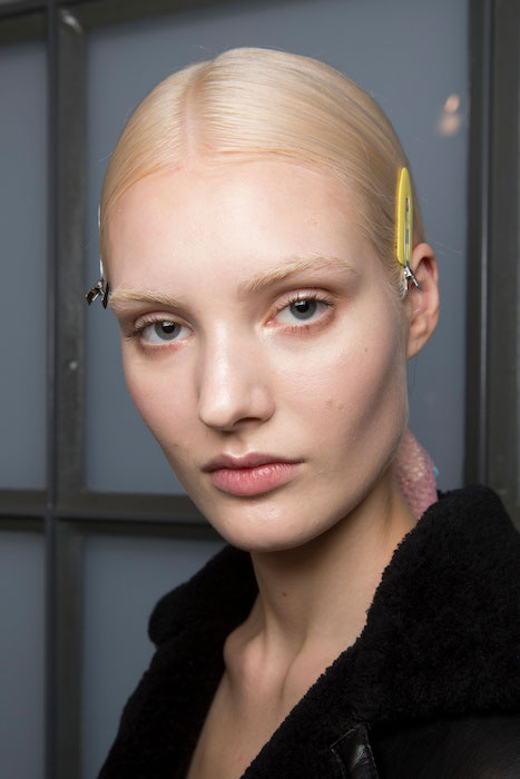 У всех моделей обесцвечены брови. Для такого эффекта не нужно радикальных мер, достаточно нанести послойно на брови светлый консилер или тон. Плотное покрытие полностью перекрывает даже очень темные брови. Обесцвеченные брови — интересный прием, когда хочется сделать акцент, например, на глаза или на идеальную кожу.