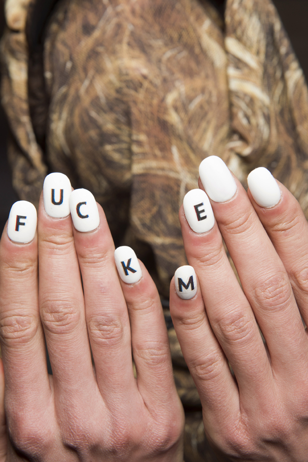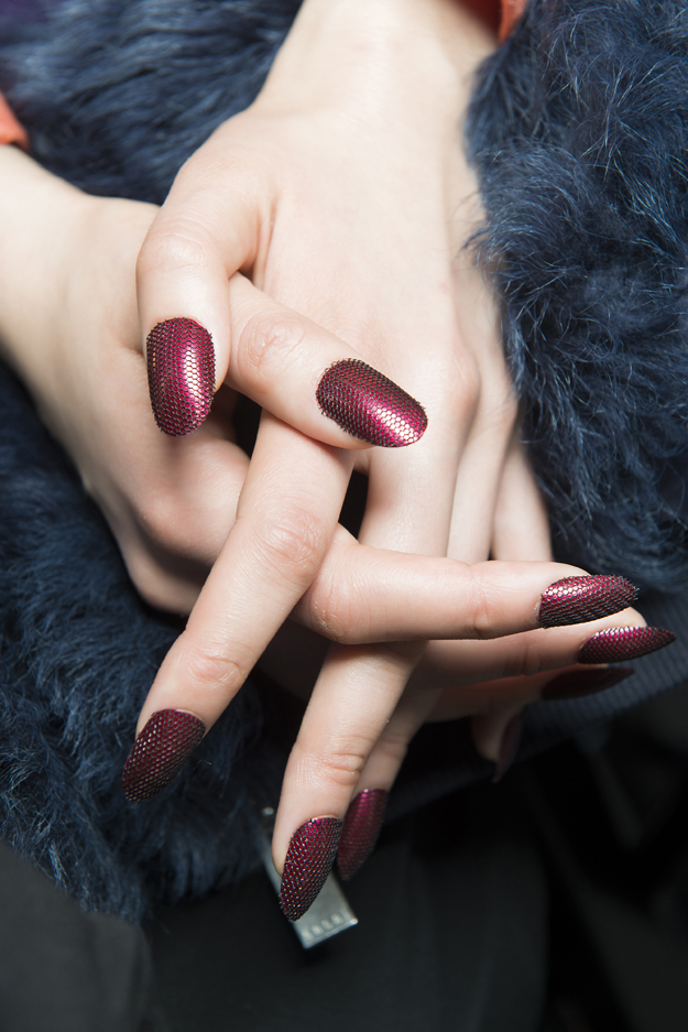 Ближе к зиме обратите внимание на фактурные дизайны. Например, шершавое покрытие от сетки, как на показе Tadashi Shoji, или выпуклая абстрактная фактура, как на Gareth Pugh. Самостоятельно такой дизайн повторить будет сложно, поэтому лучше обратиться к нейл-мастерам. «Из-за актуальности кожаных вещей будет стильно смотреться и фактурный дизайн под кожу», — говорит Мария Лактюшина.