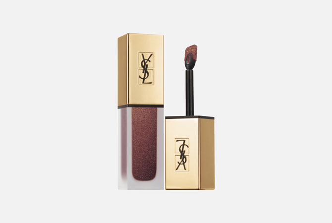 В одной этой помаде бренд собрал сразу несколько трендов. Она жидкая, матовая и металлическая. Среди шести оттенков самый темный — коричневый под номером 105. Теплый, с красным подтоном и золотыми мельчайшими блестками.
