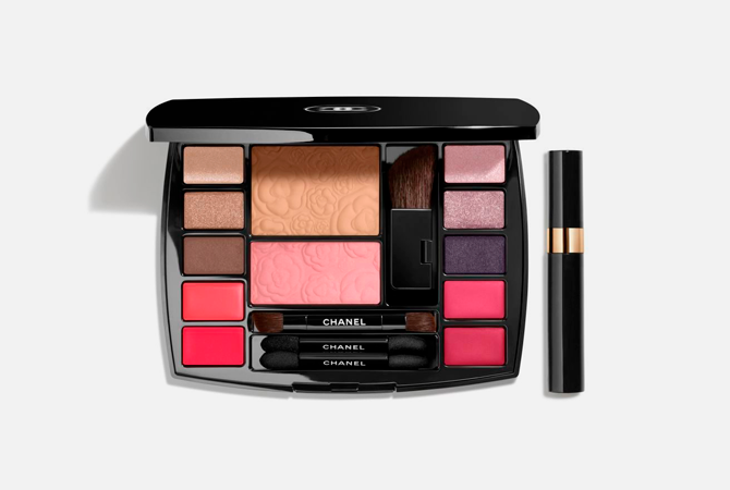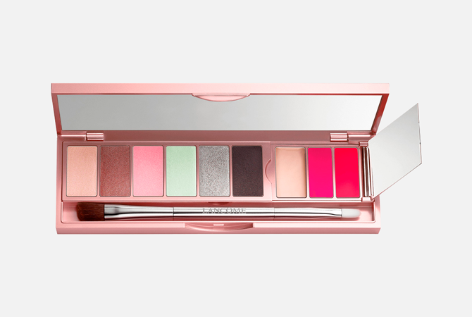 Палетка создана специально для путешествий, поэтому в нее входит полный набор для макияжа глаз, лица и губ: пудра с оттенком загара и легким сиянием, румяна с морозным эффектом, две помады красных оттенков, а также тени в нестандартной гамме — сиренево-фиолетовой. В комплекте с палеткой — тушь, две мини-кисти и аппликаторы.