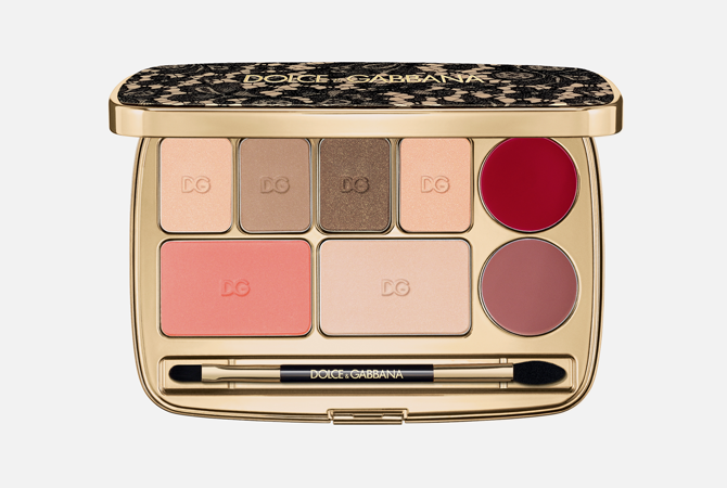 Компактная палетка в золотом футляре украшена черными кружевными узорами. Внутри — 8 универсальных оттенков для макияжа глаз, губ и лица. В больших прямоугольных рефиллах представлены румяна и пудра, в круглых над ними — тени с матовой и мерцающей текстурами. Для макияжа губ — красная и сливовая помада.
