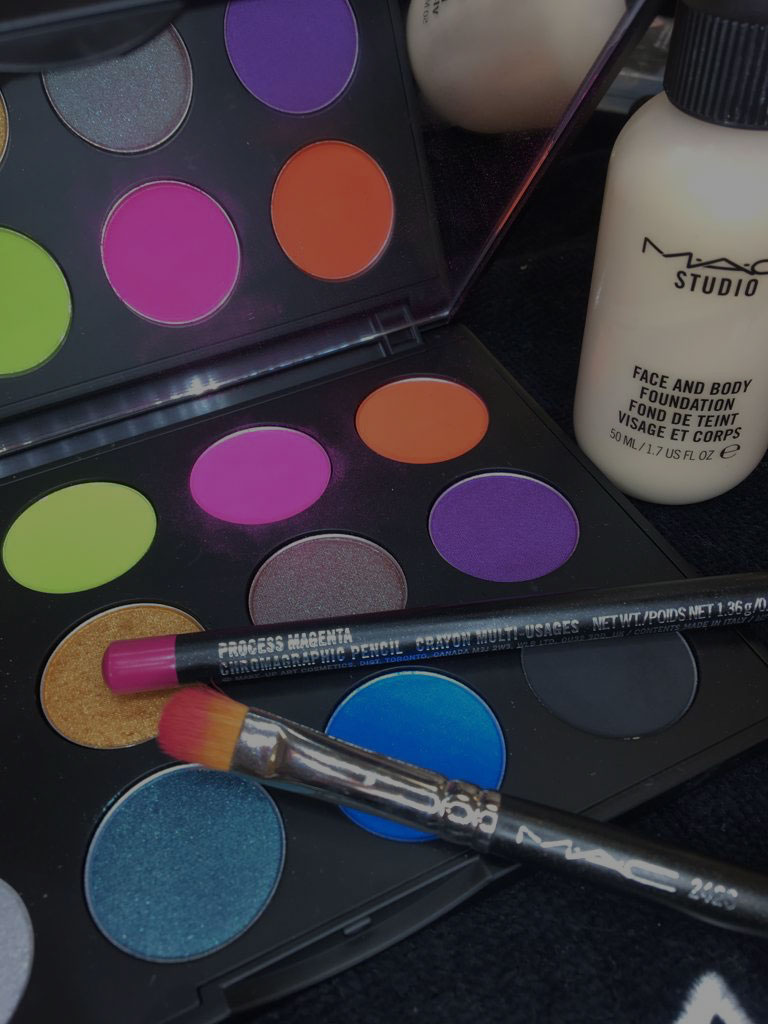 Основные продукты для макияжа: тональная основа Face&Body Foundation, консилер Studio Waterweight Concealer, чёрный кайал, карандаш для глаз Chromographic в оттенке Process Magenta и тени из новой коллекции Art Library.