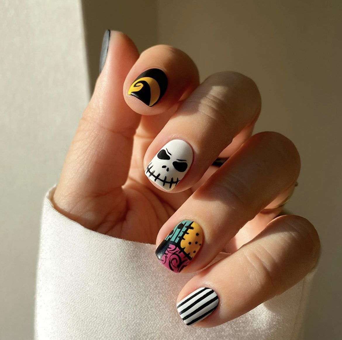 Вы не готовы к Хеллоуину, если не пересмотрели мульт «Кошмар перед Рождеством» хотя бы пару раз. Совместить сеанс можно с маникюром и изобразить на ногтях главного героя — милашку Джека Скеллингтона.