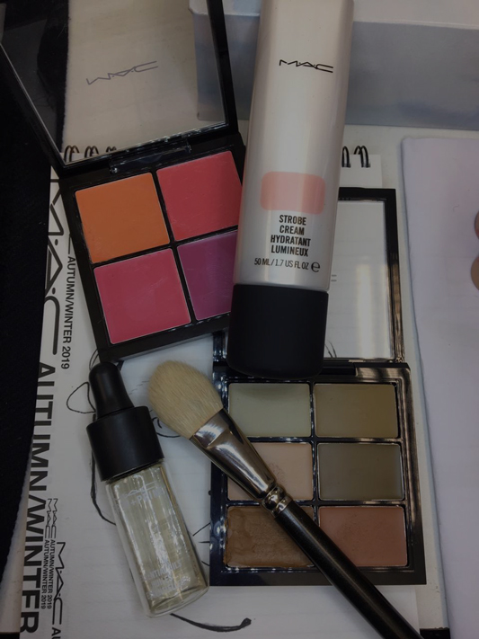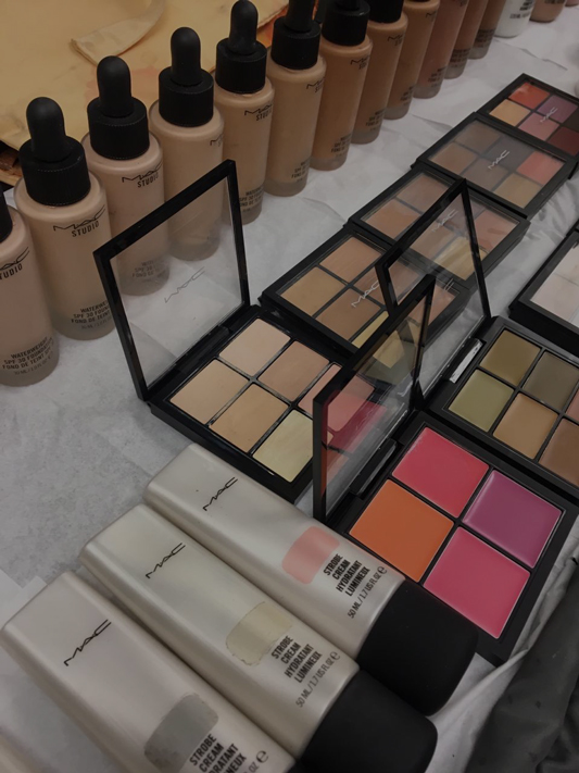 В макияже мы миксовали тональное средство Studio Waterweight Foundation и увлажняющий крем с эффектом сияния Strobe Cream. Оттенок сияющего крема мы подбирали индивидуально под тон кожи: кому-то золотой, кому-то розовый, а девушкам с темным цветом кожи на