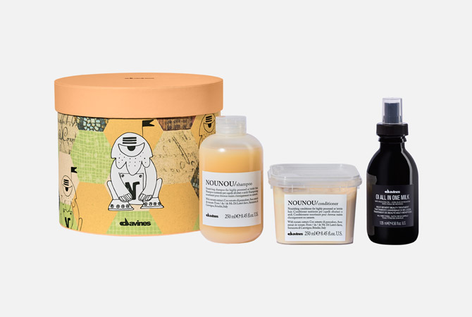 К Новому году марка выпустила несколько наборов: для разглаживания, ухода за вьющимися волосами, блеска и подготовки к укладке. Из них самый универсальный, подходящий для всех типов волос и необходимый в зимнее время — набор для питания. В его состав вошли шампунь, кондиционер и несмываемое молочко.