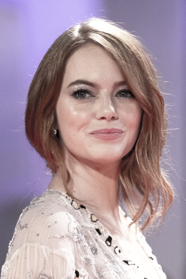 Наиболее заметный и необычный образ продемонстрировала Эмма Стоун на премьере фильма «Фаворитка». Персиковые румянец и помада сочетались с интенсивным сияющим макияжем глаз в серебряно-сиреневой гамме. Дополняет макияж легкая укладка на одну сторону и кусочки фольги на прядях.