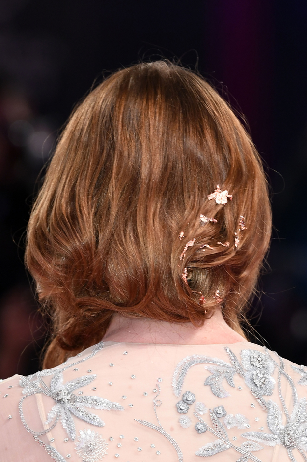 Модель появилась в классическом для красной дорожки образе — волосы от середины длины накручены в мягкие локоны и уложены набок, в макияже сделан акцент на глаза, они немного вытянуты к вискам при помощи смоки и накладных ресниц. Кожа сияет, и на губах — нюдовое покрытие.