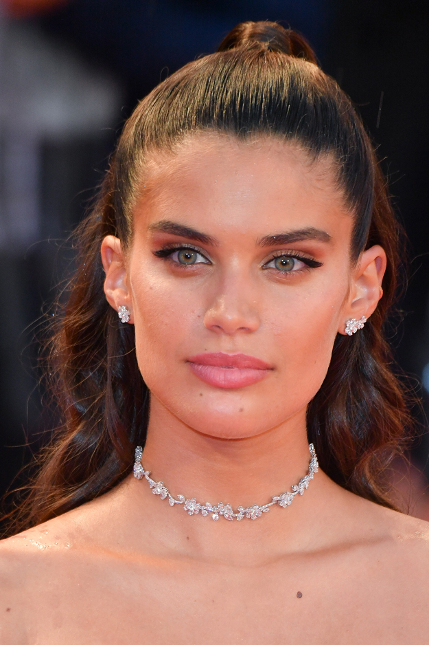 Модель стала чуть ли не единственной, появившейся на красной дорожке в образе со стрелками. Черные прямые стрелки с утолщением вытягивают форму глаз и красиво продолжают ресничный ряд. Волосы зачесаны назад, и верхняя часть собрана в хвост.