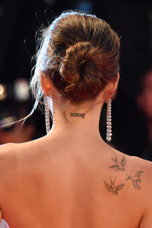 На премьере фильма «Суспирия» актриса появилась со своей излюбленной прической — низким пучком и выпущенными вдоль лица прядями. В макияже продемонстрирован трендовый прием — круглые смоки без растушевки и вытягивания к вискам. На губах — матовая помада цвета чайной розы.
