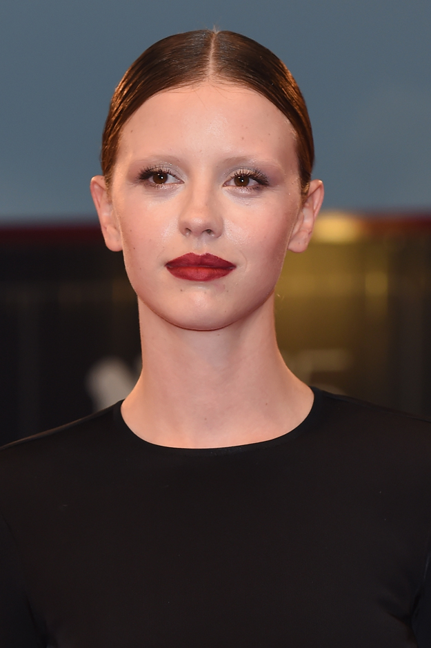 На премьере фильма «Суспирия» актриса продемонстрировала драматичный образ в главных осенних тенденциях. Волосы со sleek-эффектом собраны в низкий пучок-узел. Кожа проработана матовым тоном, на глазах — светлые серо-голубые тени с мерцанием, брови обесцвечены, и акцент сделан на губы, покрытые красной матовой помадой с легким металлическим блеском.