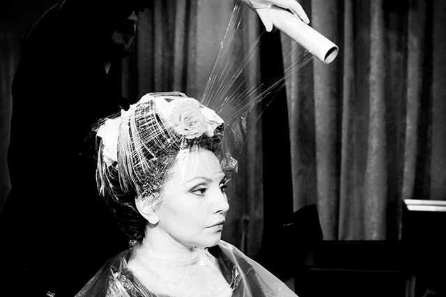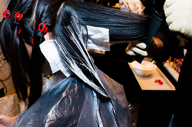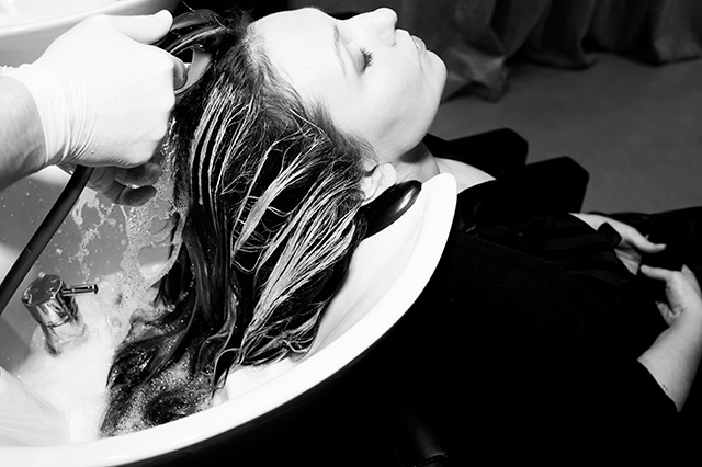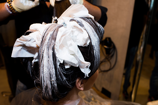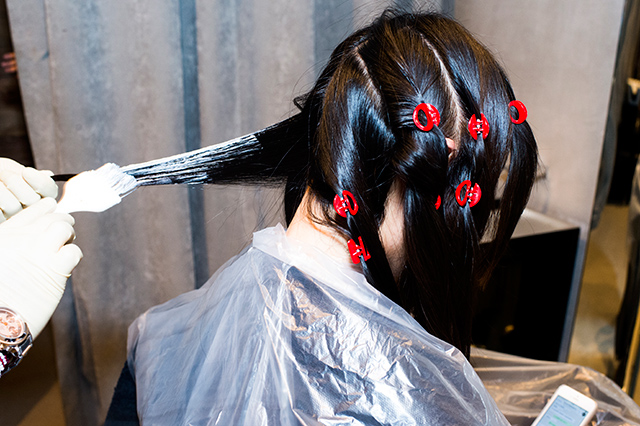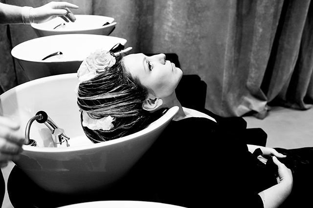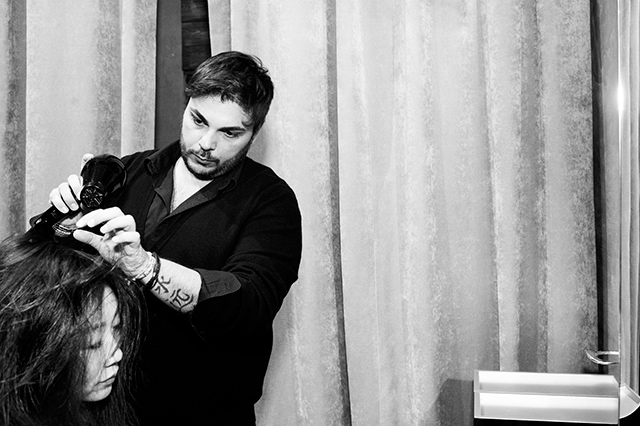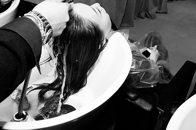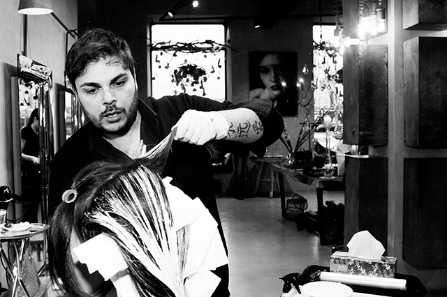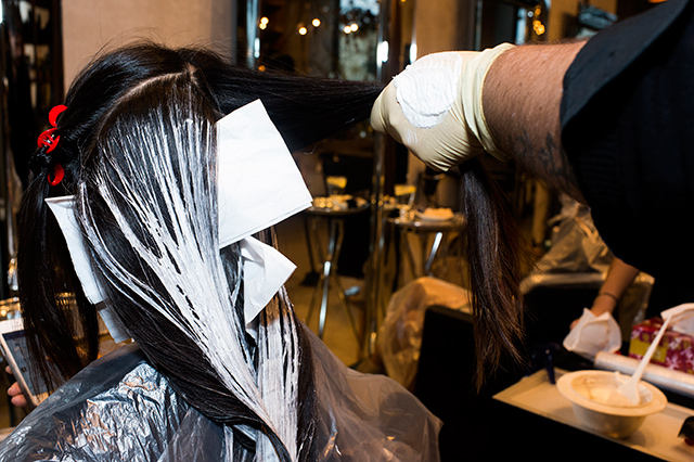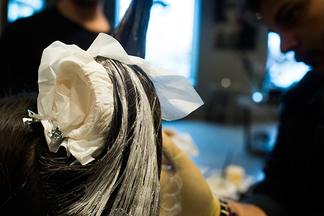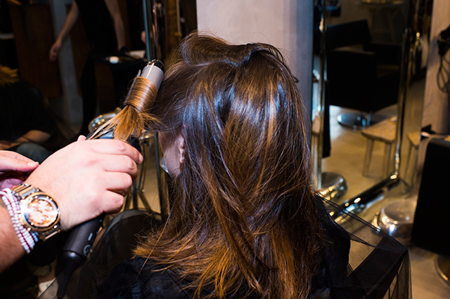 И вновь процедура занимает не более 30 минут: во-первых, каждому мастеру салона помогает ассистент, во-вторых, краска выдерживается 5—15 минут в зависимости от волос. Во время шатуша Анджело разделил волосы уже на несколько прядей, обратив особое внимание на верхнюю часть волос и кончики, прокрашивая их обильнее.