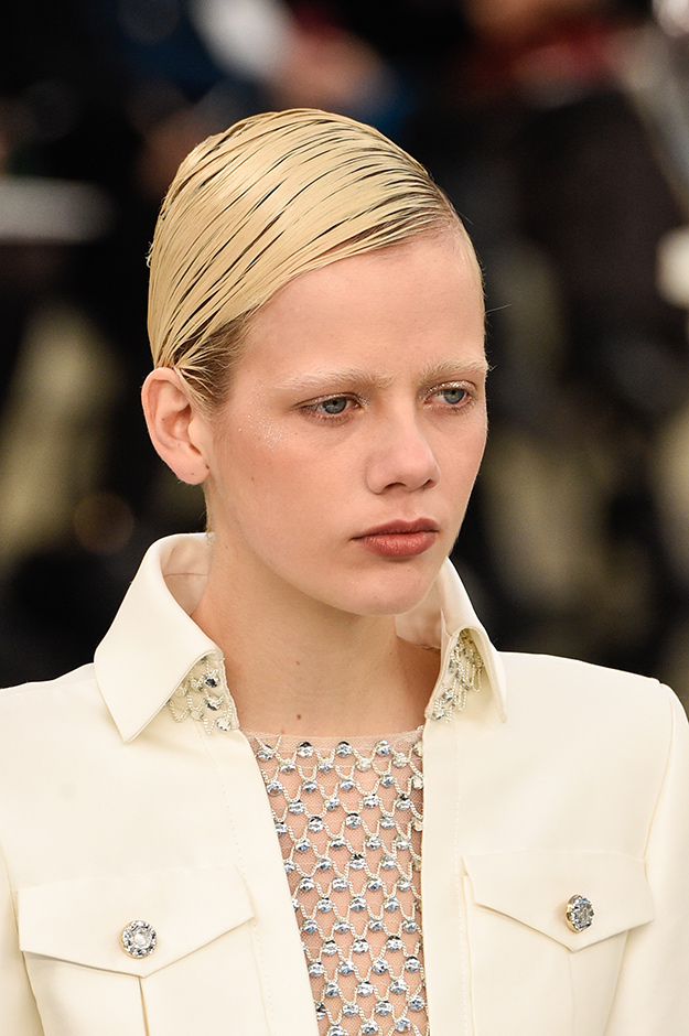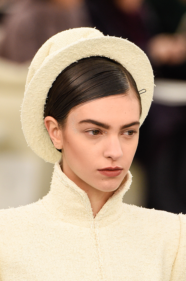 Безапелляционную женственность новой кутюрной коллекции Карла Лагерфельда поддержали сдержанные макияж и прически.