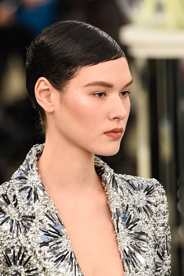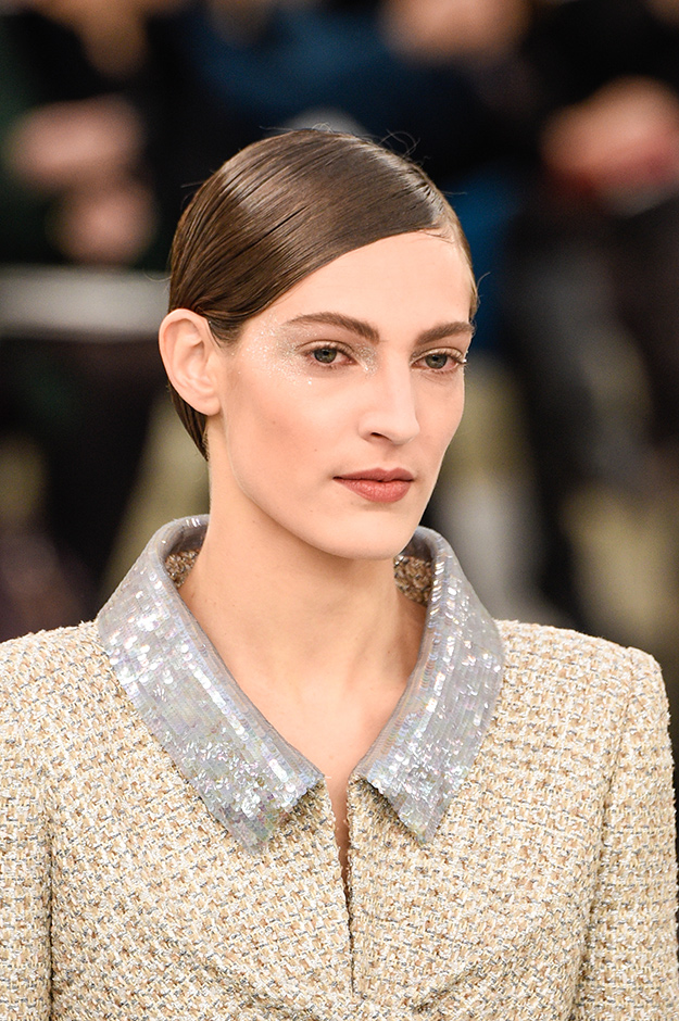 Макияж перекликался с зеркальными декорациями: главным акцентом стали металлические тени на веках с блестками разного размера, и они же — в качестве хайлайтера на скулах. Такого эффекта можно добиться при помощи кремовых теней Chanel. Дополняли образ скульптурирование и помада «возрастного» оранжево-коричневого оттенка.