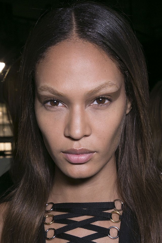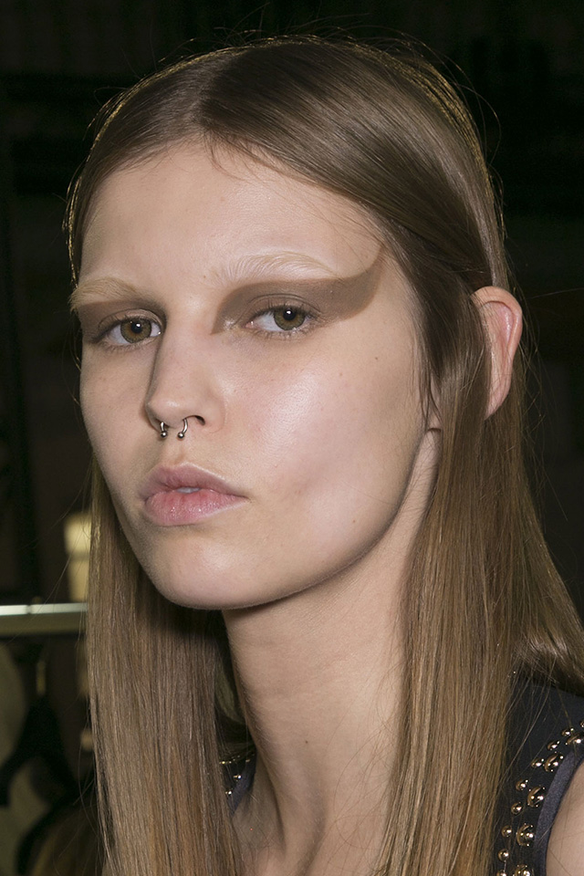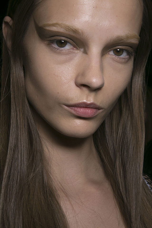 На показе Givenchy Кару Делевинь было сложно сразу узнать даже многочисленным поклонникам модели. И неудивительно, ведь для весеннего образа визажист Пэт МакГрат пошла ва-банк и покрасила брови моделей в тон коже. Образ получился несколько инопланетный, но в то же время очень женственный. Начала визажист с классики: сияющая прозрачная база под макияж, немного консилера и минимум пудры. Получилась еще одна вариация всем известного nude, дополненная натуральной помадой и прозрачной тушью для ресниц. Но дальнейший макияж глаз заставил нас затаить дыхание. МакГрат осветлила моделям брови, буквально "стерев" их с лица, и нанесла влажной кистью на веки насыщенные бежевые тени от переносицы до виска в духе театра кабуки. В такой интерпретации естественные бежевые оттенки приобрели яркость и драматизм.