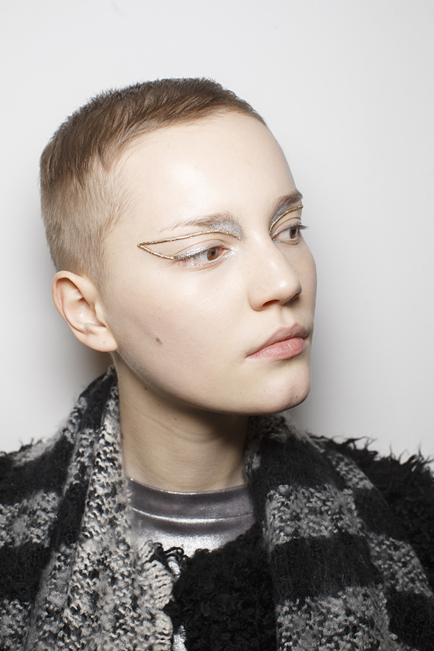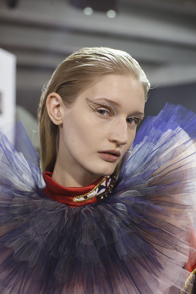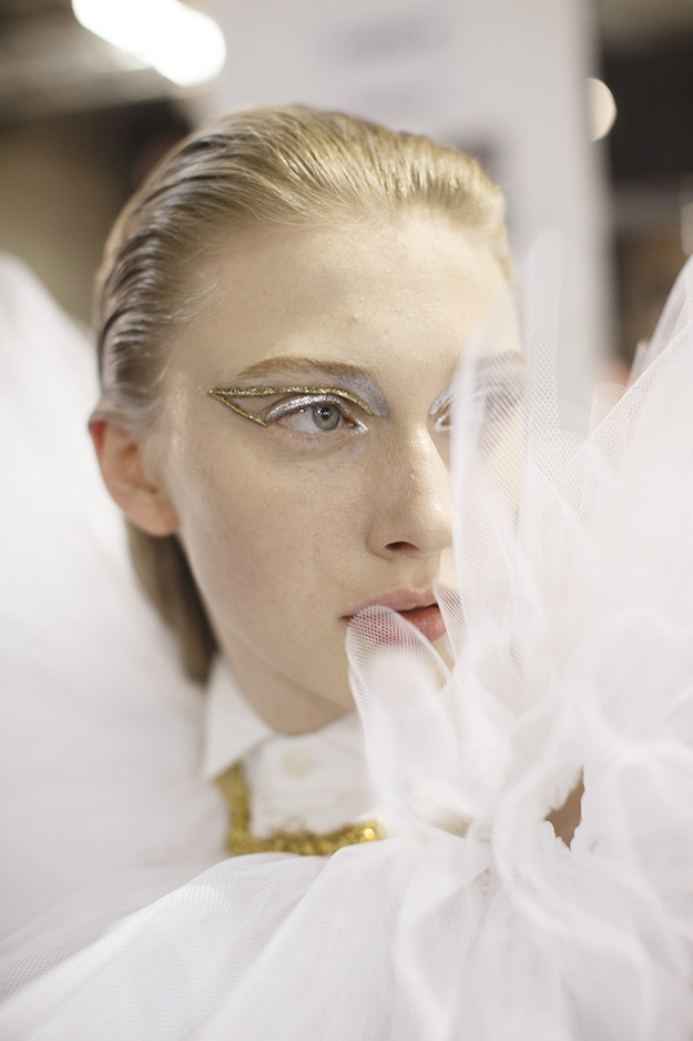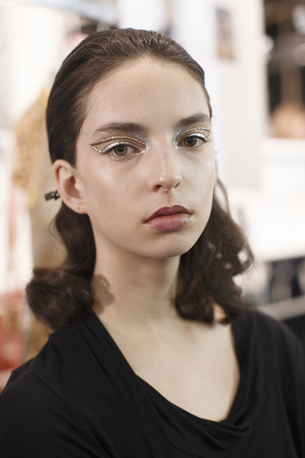 Чтобы ничто не отвлекало от платьев, состоящих из множества фрагментов других платьев, легендарный визажист показа Пэт Макграт решила сделать сдержанный макияж, но сохранить авторский стиль. Совершенно верно, глиттер имел место быть. Среди нюдового лица и слегка розоватых губ выигрышно выделялись графические стрелки на глазах с металлическими мазками под бровью у основания глаза. Желтые металлические каркасы представляли собой контур кошачьих стрелок — повторить их вы можете с помощью золотой жидкой подводки. Серебряные штрихи акцентировали внимание на внутренних уголках глаза. Их можно сделать с помощью глиттера или белого карандаша.