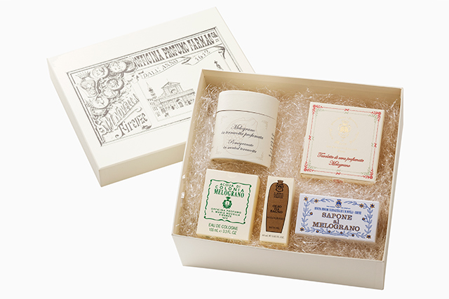 Из всего богатого ассортимента знаменитой флорентийской аптеки (год назад появившейся в Москве) мы выбрали два набора. Главным героем набора стал сладкий гранат, аромат которого воплощен в виде глиняной фигурки граната для ароматизации помещения. Компанию ему составили одеколон, очищающее масло для ванны, мыло и ароматические восковые пластинки.