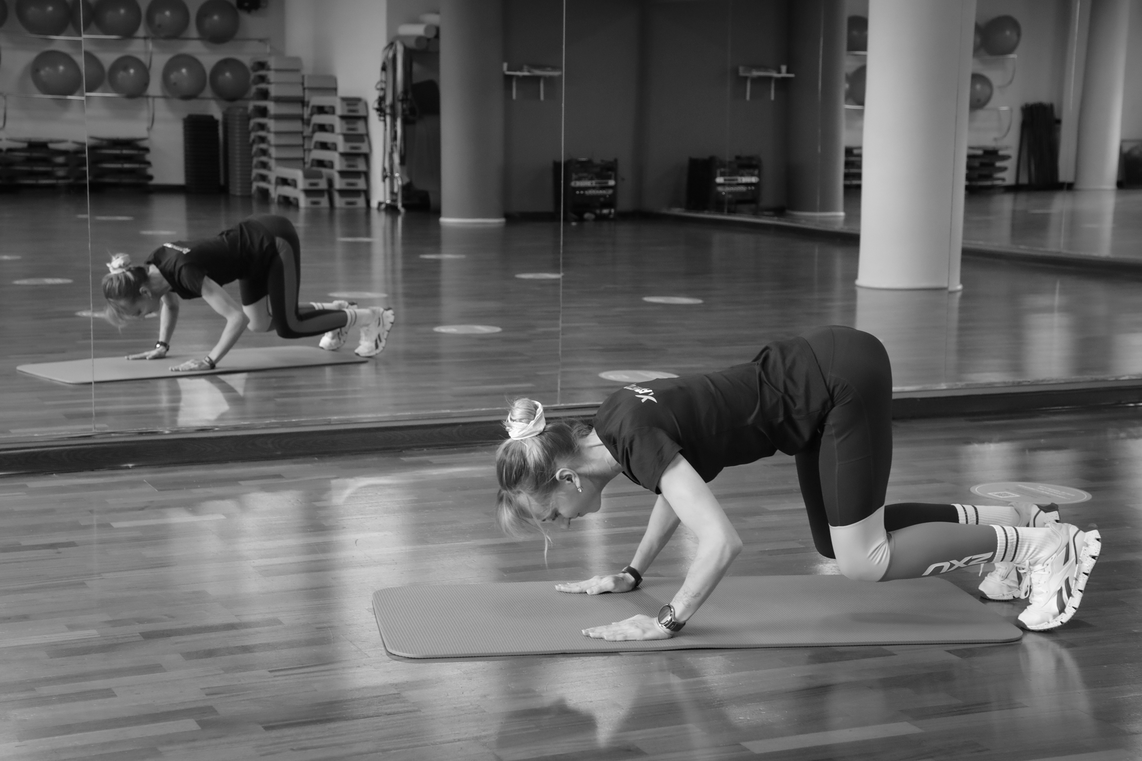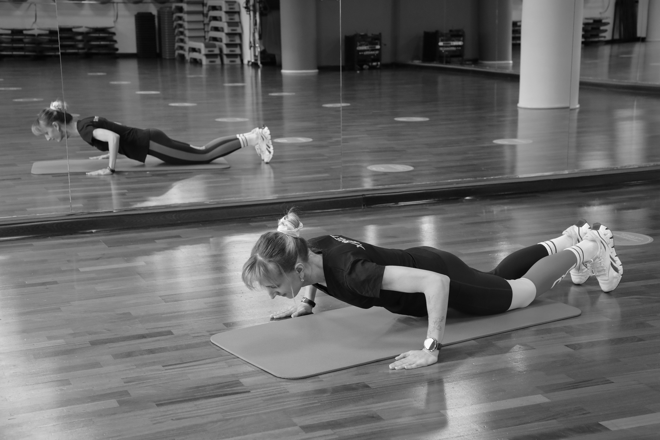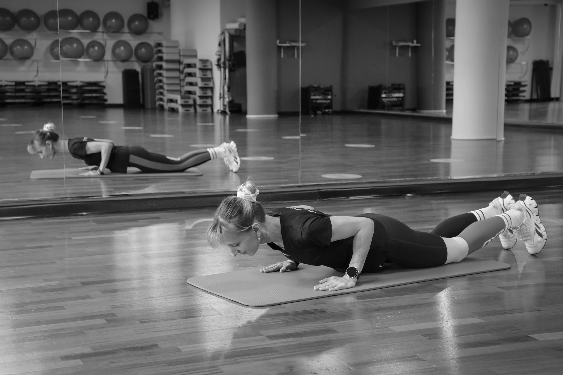 Если вы занимаетесь дома без оборудования, то самое эффективное — отжимания всех видов. Начнем с классических: руки поставьте шире плеч, опора либо на стопы, либо на колени, а весь корпус удерживает планку. На вдох, сохраняя сильный живот и ровную спину, согните руки под углом 90°. На выдох — как будто отталкиваясь руками от пола, вернитесь в исходное положение. Первые несколько тренировок делайте максимальное количество повторений до тех пор, пока можете отжаться без сильных искажений в технике движения. После — доводите до 15–20 повторений за один подход.