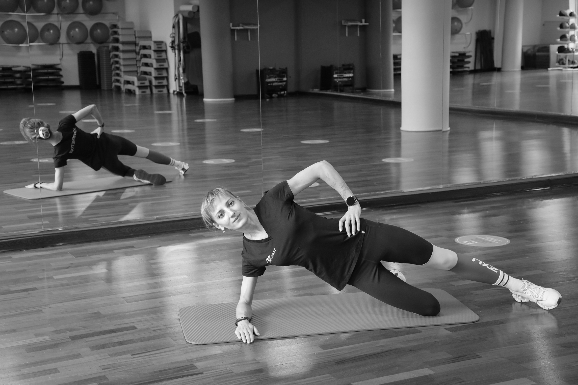 Боковая планка, но немного облегченная. Исходное положение — лежа на боку с опорой на предплечье. Опорную ногу согните, а другую вытяните в одну линию со спиной. Проверьте, чтобы колени лежали друг на друге, а затем оттолкнитесь от пола предплечьем и потянитесь по обеим сторонам талии, чтобы расстояние между тазовыми костями и нижними ребрами стало почти одинаковым с обеих сторон. В таком положении вытяжения приподнимайте бедро над полом, опираясь на обе ноги, и медленно опускайте вниз на пол. Чтобы упражнение помогало достичь поставленной цели, обратите внимание на то, как вы опускаетесь вниз — плечо должно быть сильным, а туловище не провисать вниз. Все время тянитесь за макушкой и напрягайте живот. Делайте по 10–12 повторений на каждую сторону, для начала можно с перерывами.