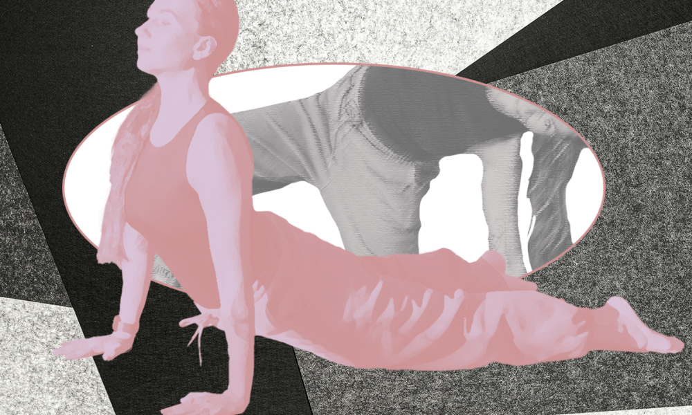 Исходное положение — «Собака мордой вверх» (как на фото). Округлите спину, поднимитесь на прямых руках и чуть согните ноги, голову опустите и направьте взгляд вниз. Это положение «Собака мордой вниз». Повторите 8–10 раз.
