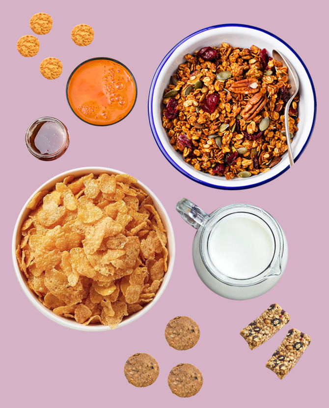 Выход: выбирайте цельные злаки — овес, ячмень, гречку или хлопья из них, но обязательно долгой варки. Попробуйте сварить кашу на кокосовом молоке или залейте гранолу без сахара миндальным молоком — и получите сытный полезный завтрак без лишних калорий.
