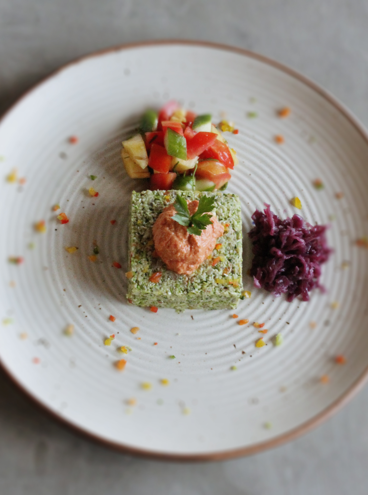 Смешайте брокколи в блендере с луком, чесноком, орегано, черным перцем, сладким перцем, порошком кешью и порошком семян подсолнечника.