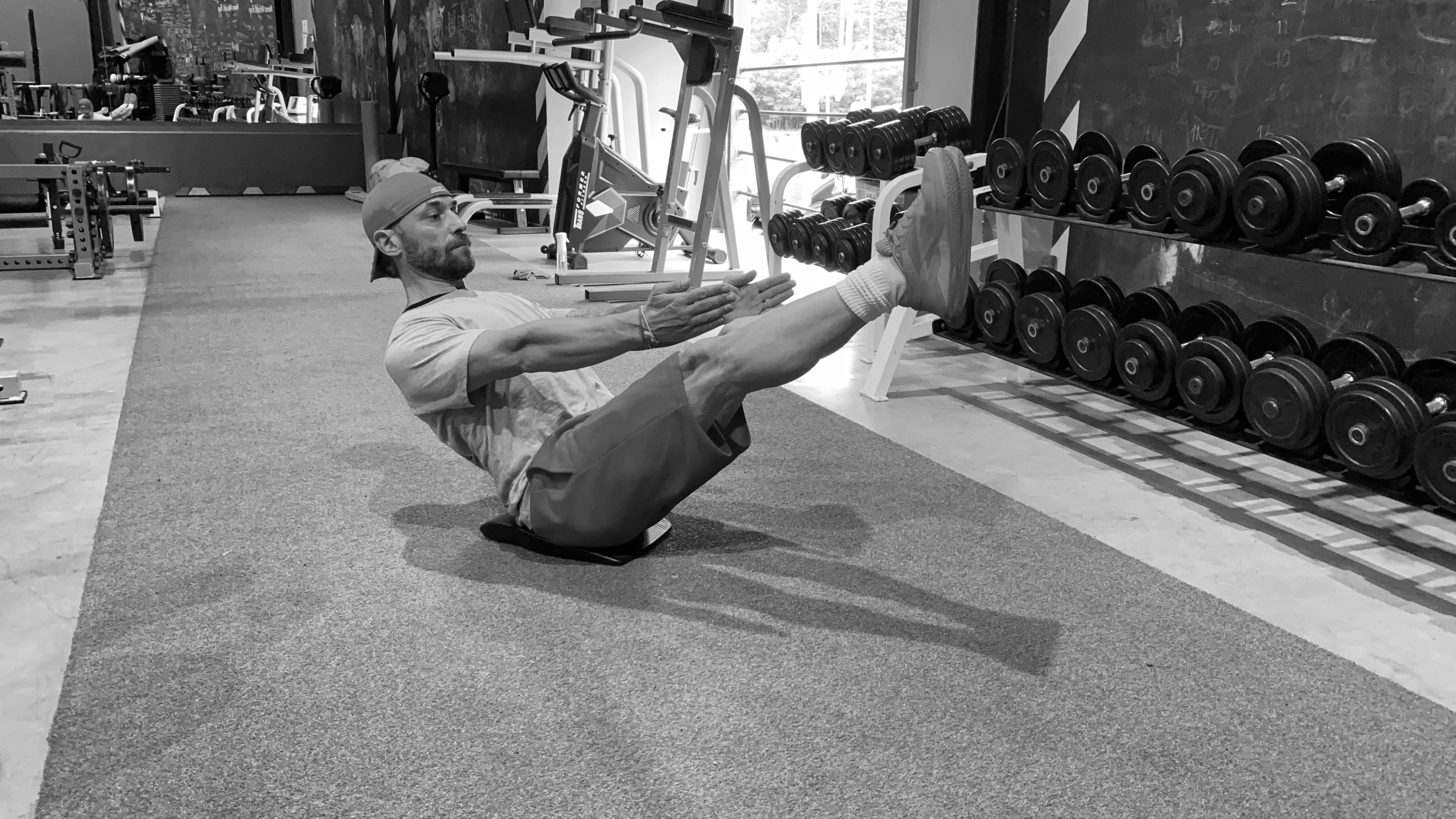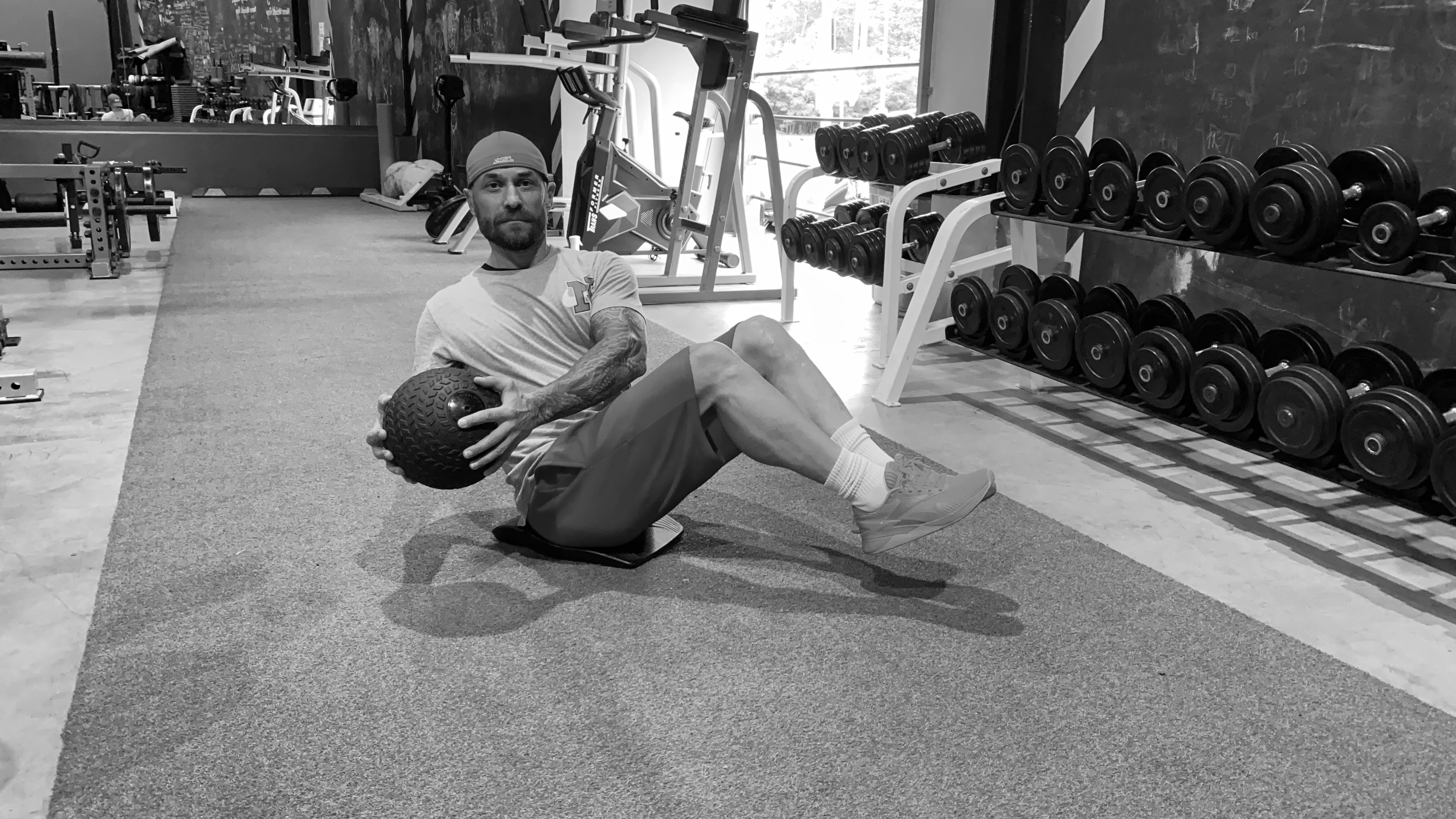 Исходное положение — сидя на полу на ягодицах. Сохраняйте угол в тазобедренном суставе и коленях прямым. Держите ровно спину. Ноги не должны касаться пола, иначе увеличится нагрузка. В руках держим медбол, не прижимая его к груди. Делаем плавные скручивания туловища, не изменяя положения ног и таза. 3 подхода по 20 повторений.