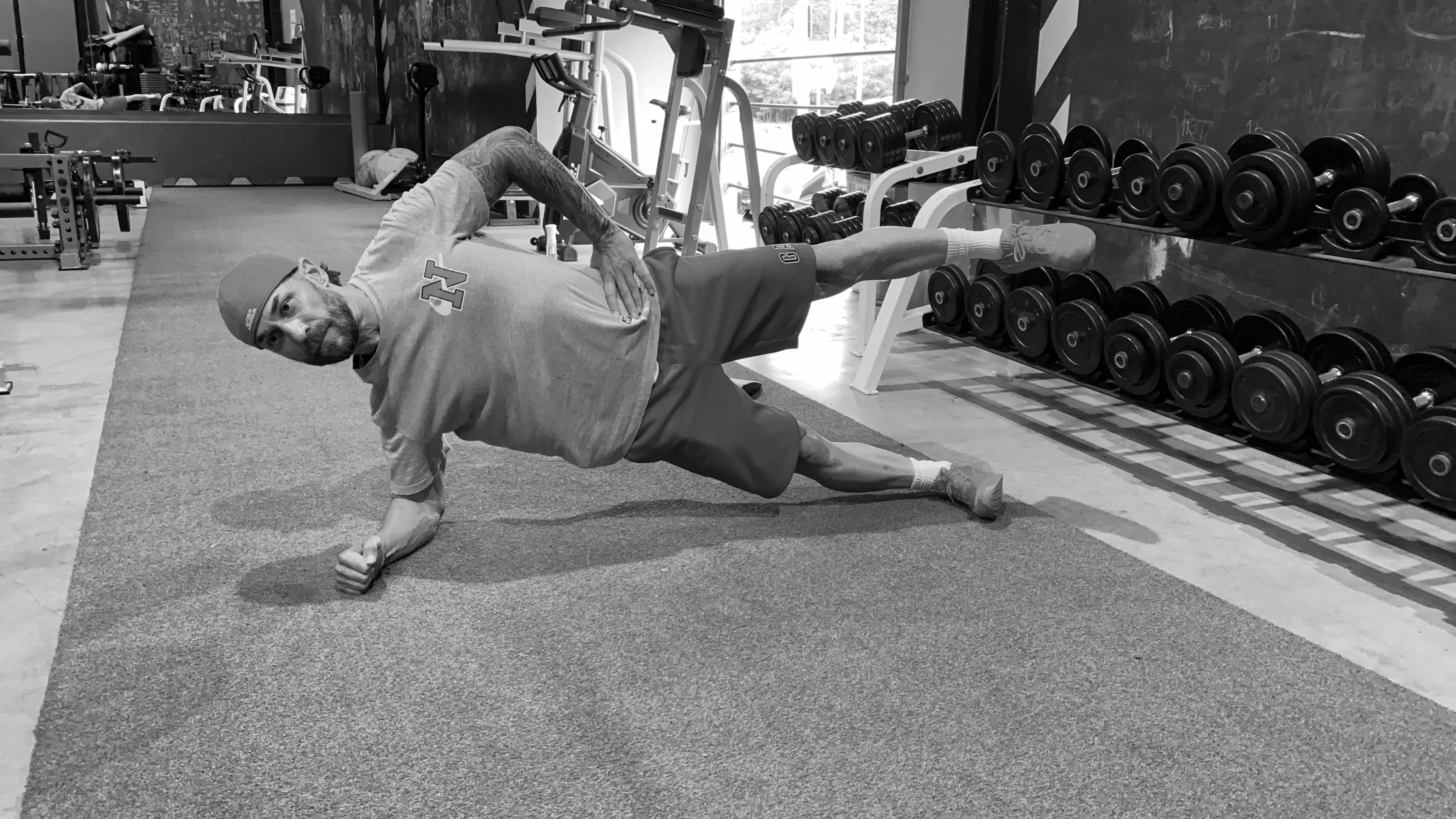 Исходное положение — стойка локтем боком. Выдерживаем нейтраль, макушка — продолжение позвоночника, лопатки слегка собраны, поясничный отдел нейтрален, таз перпендикулярен полу. Верхнюю ногу поднимаем вверх. 3 подхода по 30 секунд.