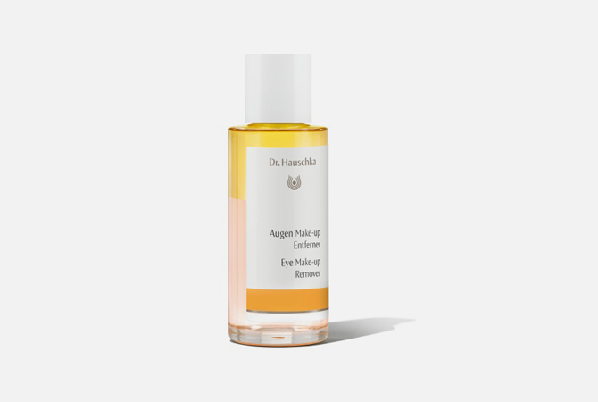 Немецкий стопроцентно натуральный бренд Dr.Hauschka выпустил средство для снятия стойкого и водостойкого макияжа с области глаз. Перед использованием флакон нужно встряхнуть, чтобы масляная и водяная фазы смешались. В состав вошли розовая вода, успокаивающие экстракты очанки и фенхеля, питательные масла кунжута и подсолнечника.