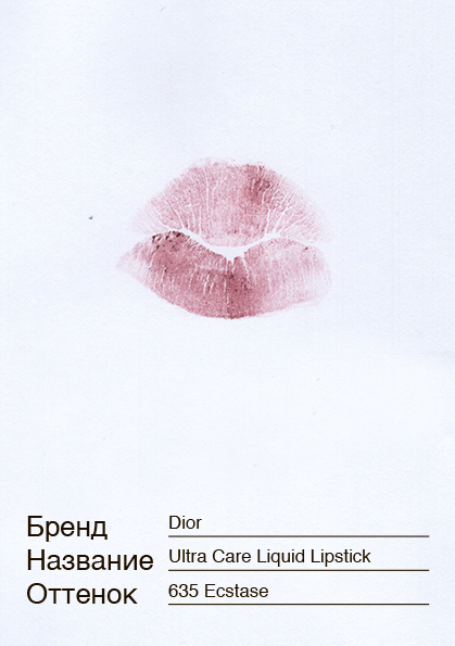 Чтобы сделать достойный отпечаток губ, пришлось сильно постараться. Помада не хотела оставлять следы на карточке, хотя и стойкой ее назвать нельзя. Наносится она очень тонко, на губах выглядит плюшевой и не сушит. Мне все нравится, особенно цвет. В день теста я после работы пошла в библиотеку готовить курсовую по постколониальной теории, и милая женщина-библиотекарь сказала, что мне он очень идет.