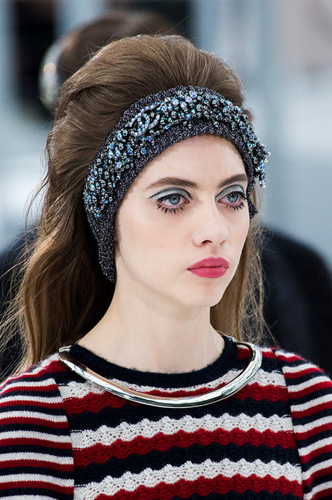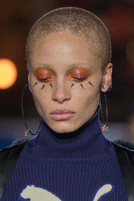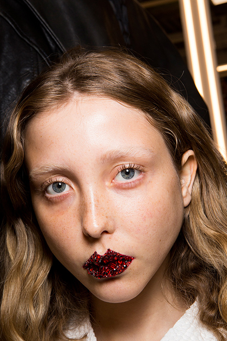 На некоторых показах макияж был дополнен эффектными украшениями на лице. У моделей с показа Gucci был пирсинг в носу, девушкам с показа Balmain надели специальный аксессуар для губ, моделям Junya Watanabe поместили на лоб необычную фурнитуру.
