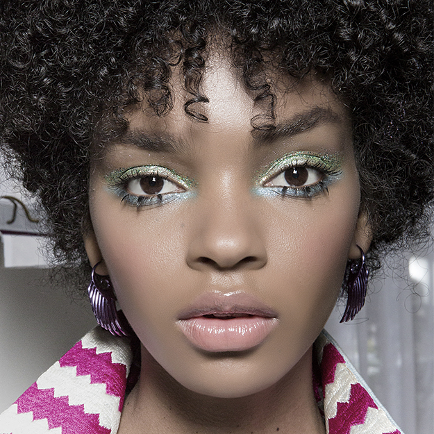 Для показа Armani Privé Линда Кантелло создала на веках плавные цветовые переходы, используя тинты голубого, мятного и сиреневого оттенков. Похожий акварельный эффект можно заметить на моделях с показа Palmer Harding, где тени есть даже на висках, что придает образу настроение хиппи. Менее контрастная идея представлена на Tadashi Shoji: на веках — перламутровые тени фисташкового оттенка, а слизистая нижнего века подведена бирюзовым кайалом. Те же оттенки использовали визажисты M.A.C. для Manish Arora: они наносили зеленые блестки на верхнее веко поверх зеленых теней, а голубые — на нижнее. Вариант для повседневного образа — скомбинировать пару идеально сочетающихся между собой оттенков и разместить их на верхнем и нижнем веках, как на моделях La Petite Robe di Chiara Boni. Образ в стилистике 60-х придумали визажисты Antonio Ortega: подвижное веко закрашено металлическими тенями, а складка прорисована контрастной цветной подводкой. Добавить сюда накладные ресницы — и получится образ Твигги.