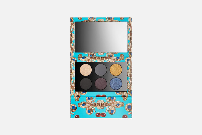 В новогоднюю коллекцию Dolce&Gabbana вошли знакомые продукты из основной линейки, но в лимитированных оттенках. Кремовые тени представлены в мерцающем светло-розовом, базовом коричневом и сияющем черном цветах. Благодаря текстуре тени можно смешивать друг с другом, получая новые оттенки. Акцент в образе можно создать при помощи подводок в золотом и бронзовом цветах. Помимо классического красного кремовая помада вышла в мерцающем бронзово-оранжевом цвете. Из новинок — наклейки на ногти в виде золотого кружева.