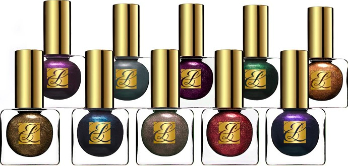 Осенняя коллекция марки Estee Lauder обратила наше внимание прежде всего благодаря своим исключительно красивым лакам для ногтей Beyond Black & Metal Mania. Для удобства коллекцию разделили на две группы. В первую группу Beyond Black Pure Color Nail Lacquer входят пять искрящихся оттенков: Caviar (серый), Bete Noire (фиолетовый), Blue Blood (темно-синий), Black Plum (сливовый) и Viper (темно-зеленый). Во вторую, под названием Metal Mania Pure Color Nail Lacquer, пять металлических: Nouveau Riche (золотой), Explosif (тауп), Chaos (серый), Smashed (фиолетовый) и Fiery Hot (красный).